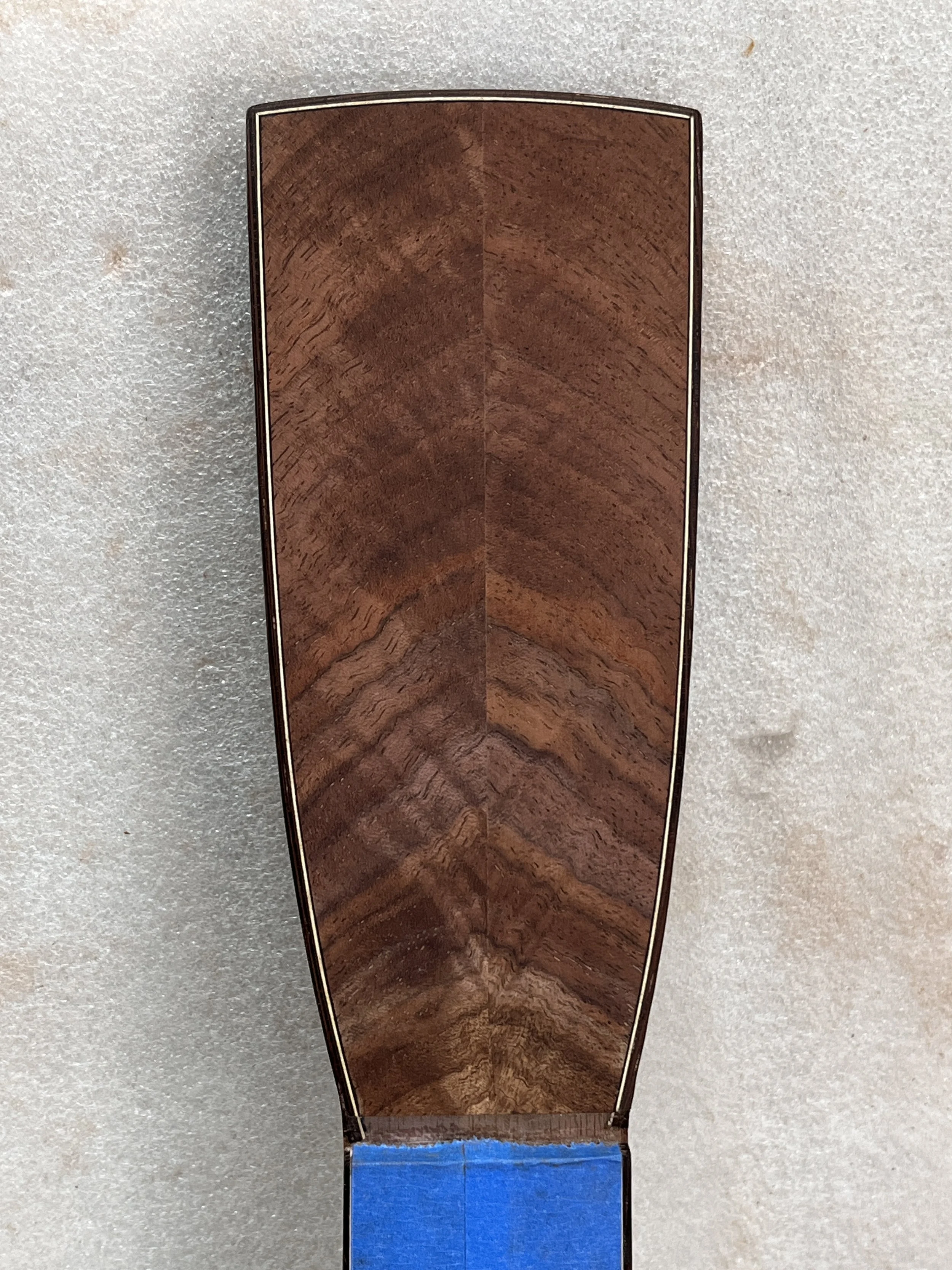 Finally, the two piece laminated neck is also bookmatched, and the grain orientation follows the contour of the Martin style volute on the back of the headstock:
