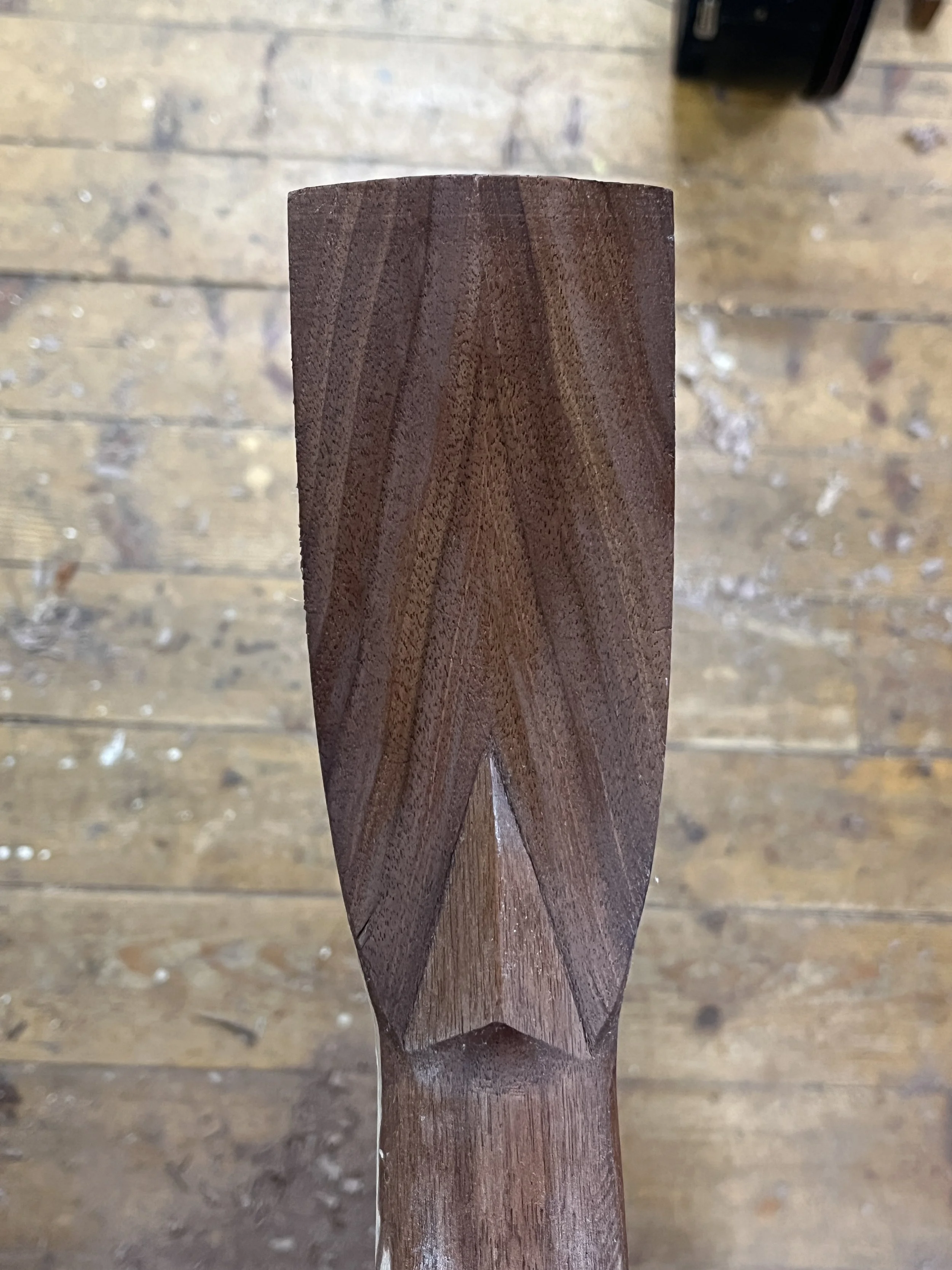 I like to repeat certain elements of the design to create a theme and unify the piece. The headplate is also bookmatched walnut, with a touch of sapwood at the bottom.