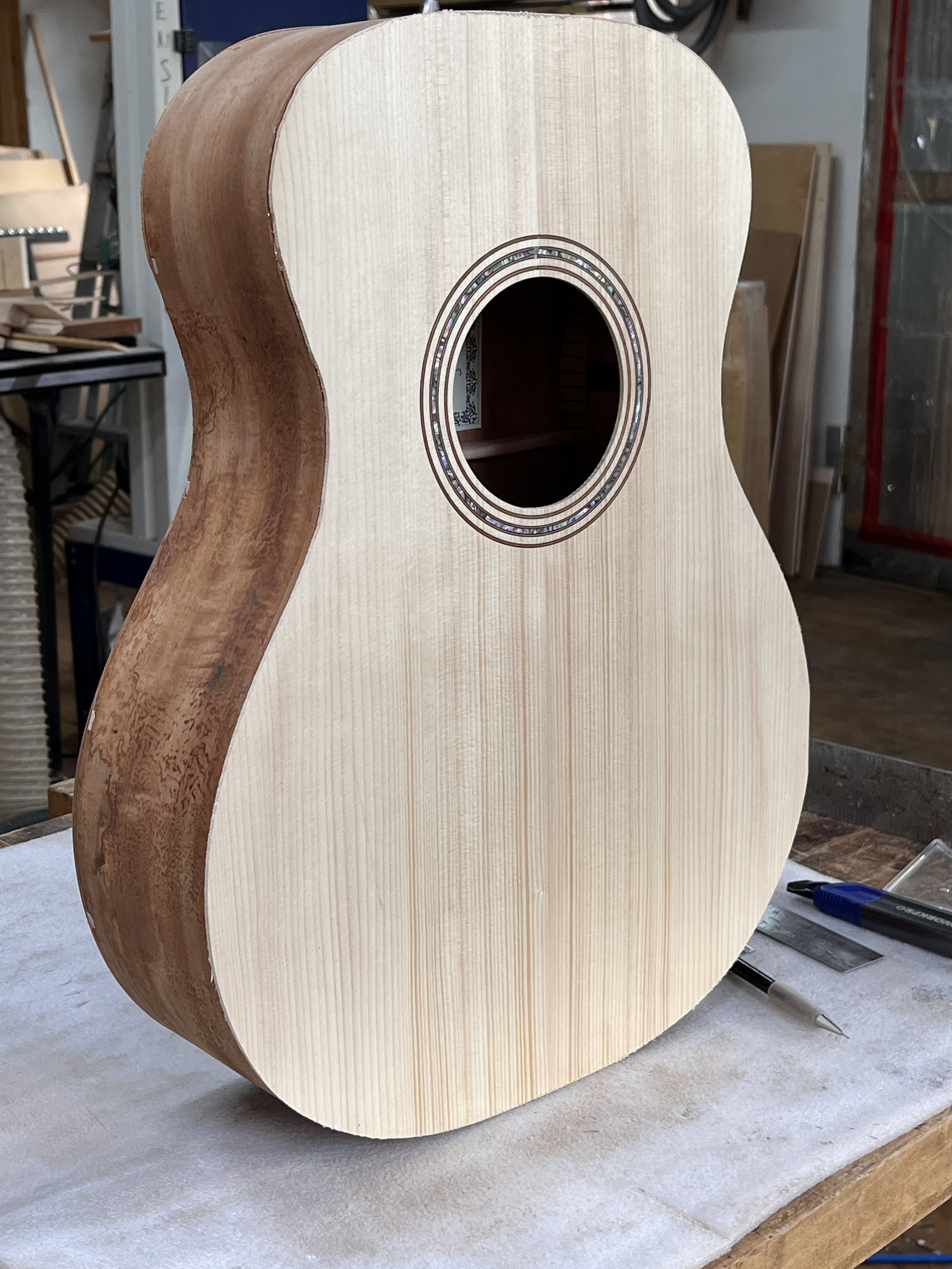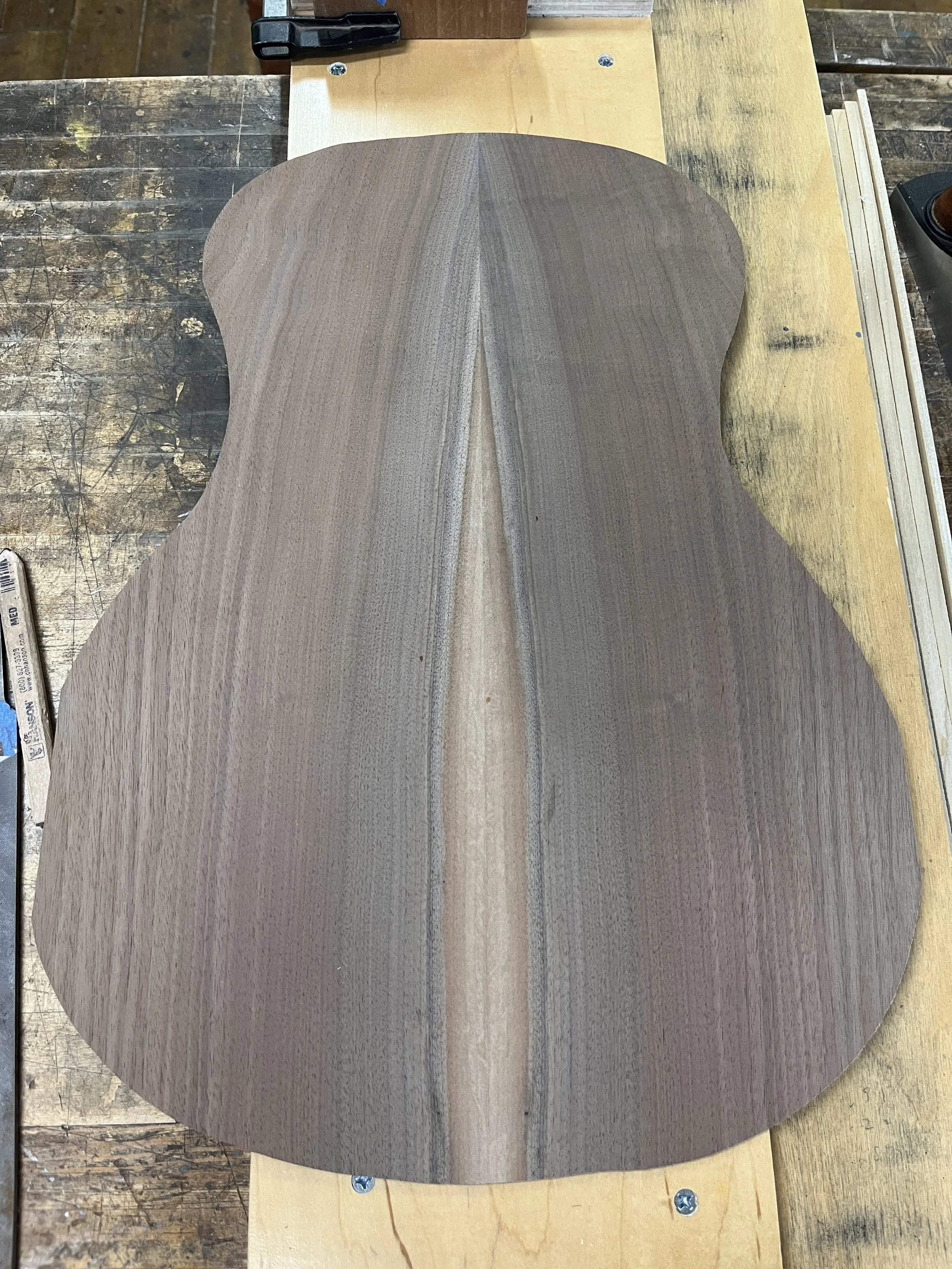 I am finishing up the walnut guitar described below, and hav started a new one. This one is 00 size, 25.5” scale, 13 fret neck, local Lyme NH spruce and Cuban mahogany. This guitar will follow a traditional build withe single ply sides and cloth reinforcement strips. W are aiming for a more vintage, open sound.