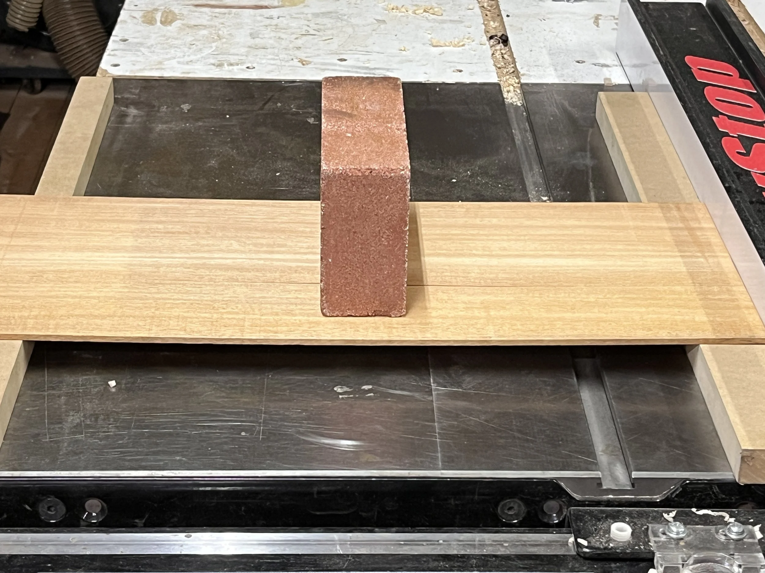 High tech rig for stiffness testing (not shown, caliper for measuring the deflection).