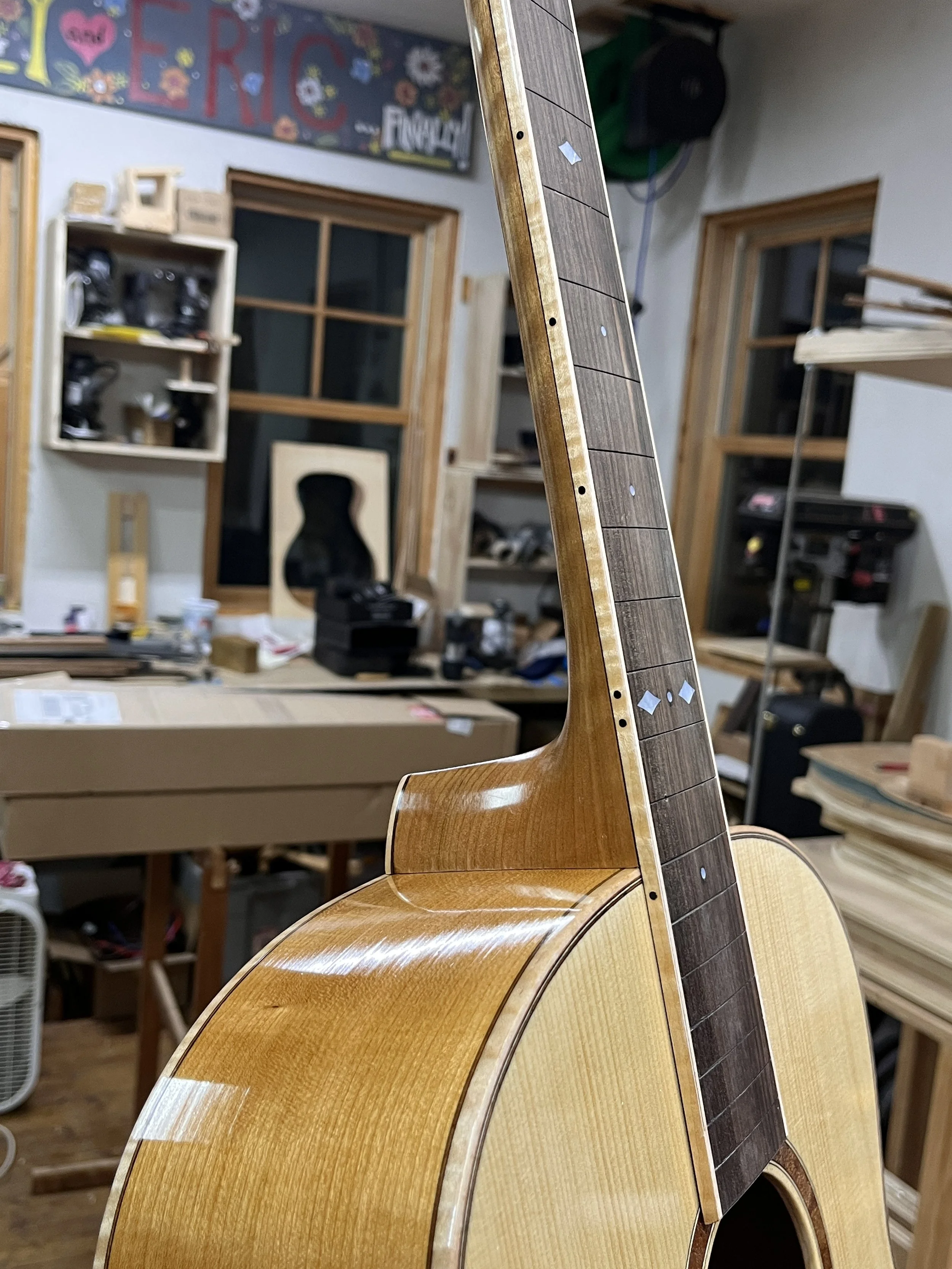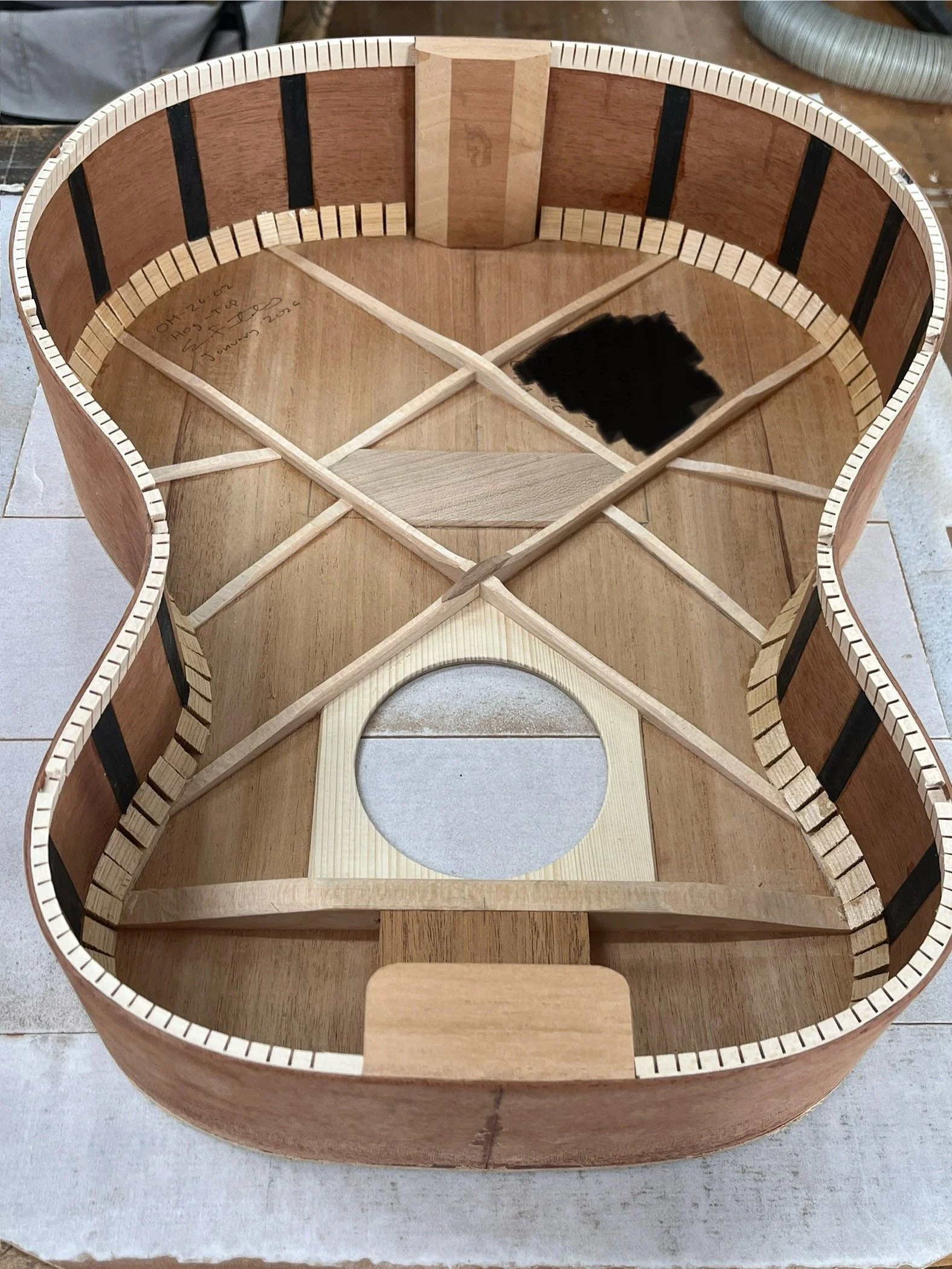 Here is a look under the hood before I glued the back on. Local clients get the opportunity to leave notes/messages/quotes/inspirational inscriptions on the interior of their guitar (blacked out).