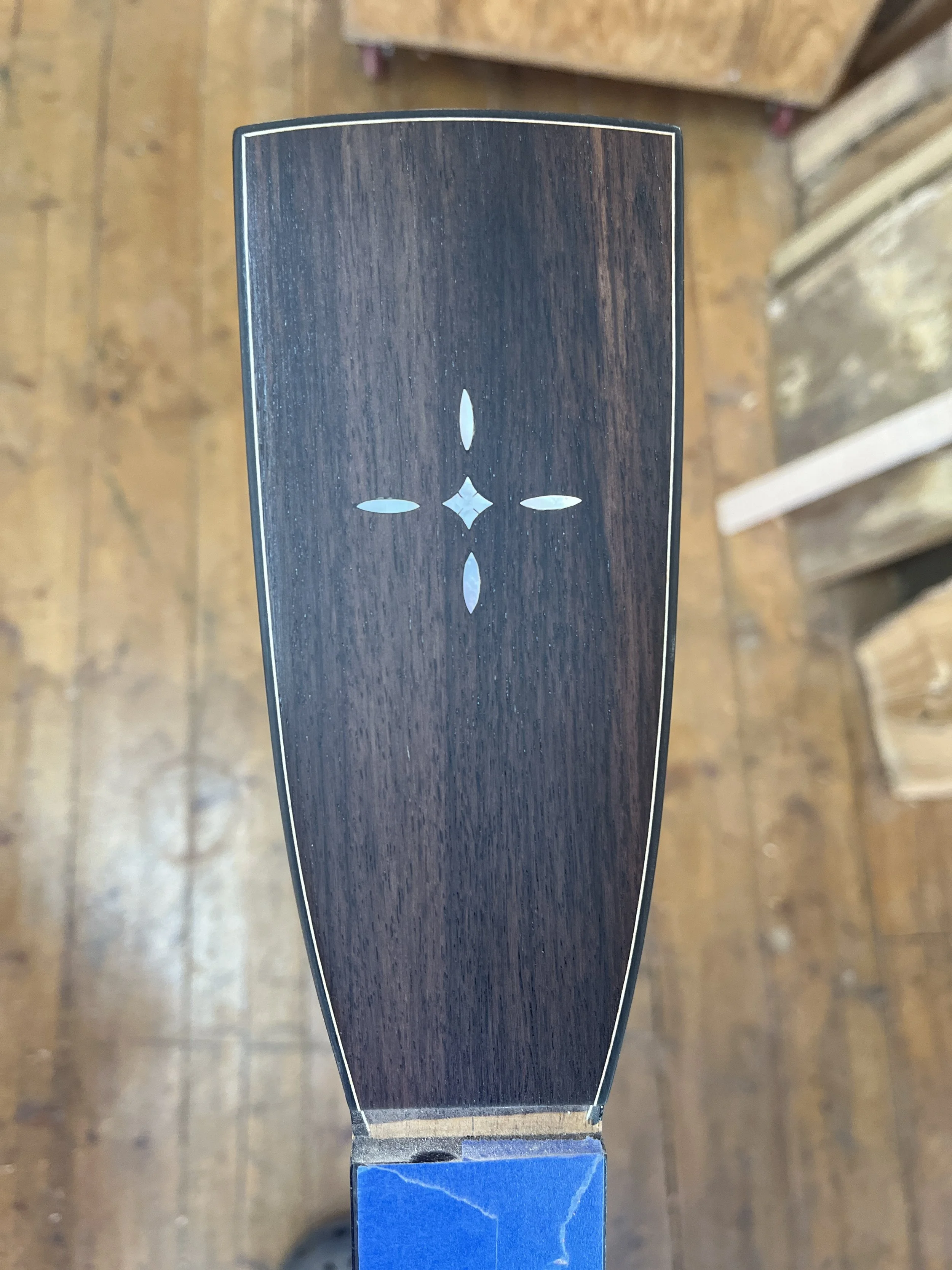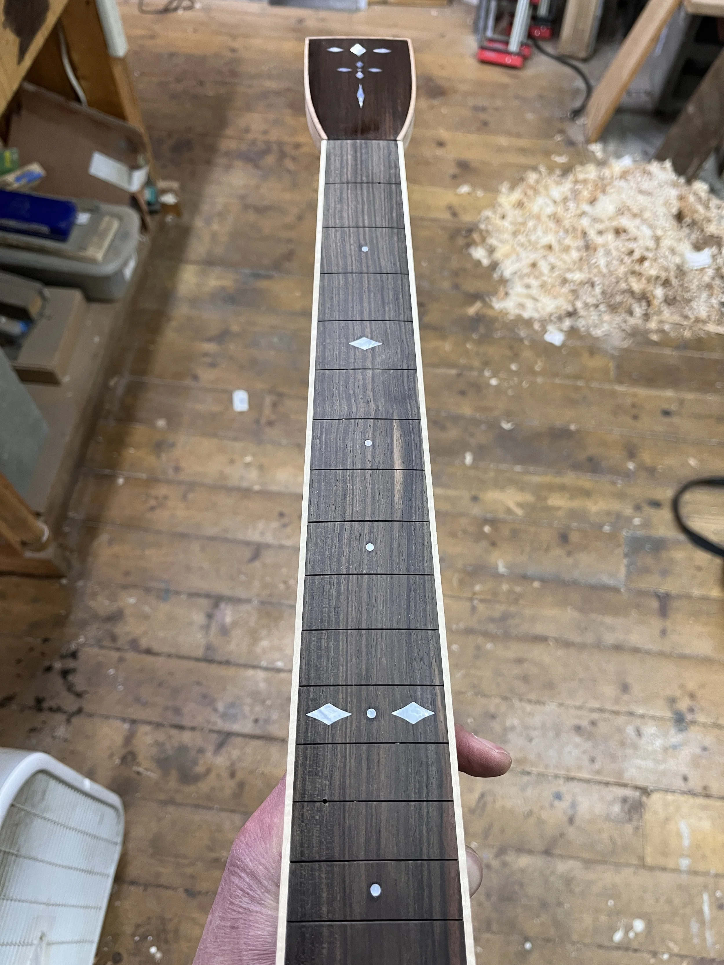 The rosette is sapele with curly maple rings, and a diamond MOP inlay (which will feature on the fingerboard and headplate):