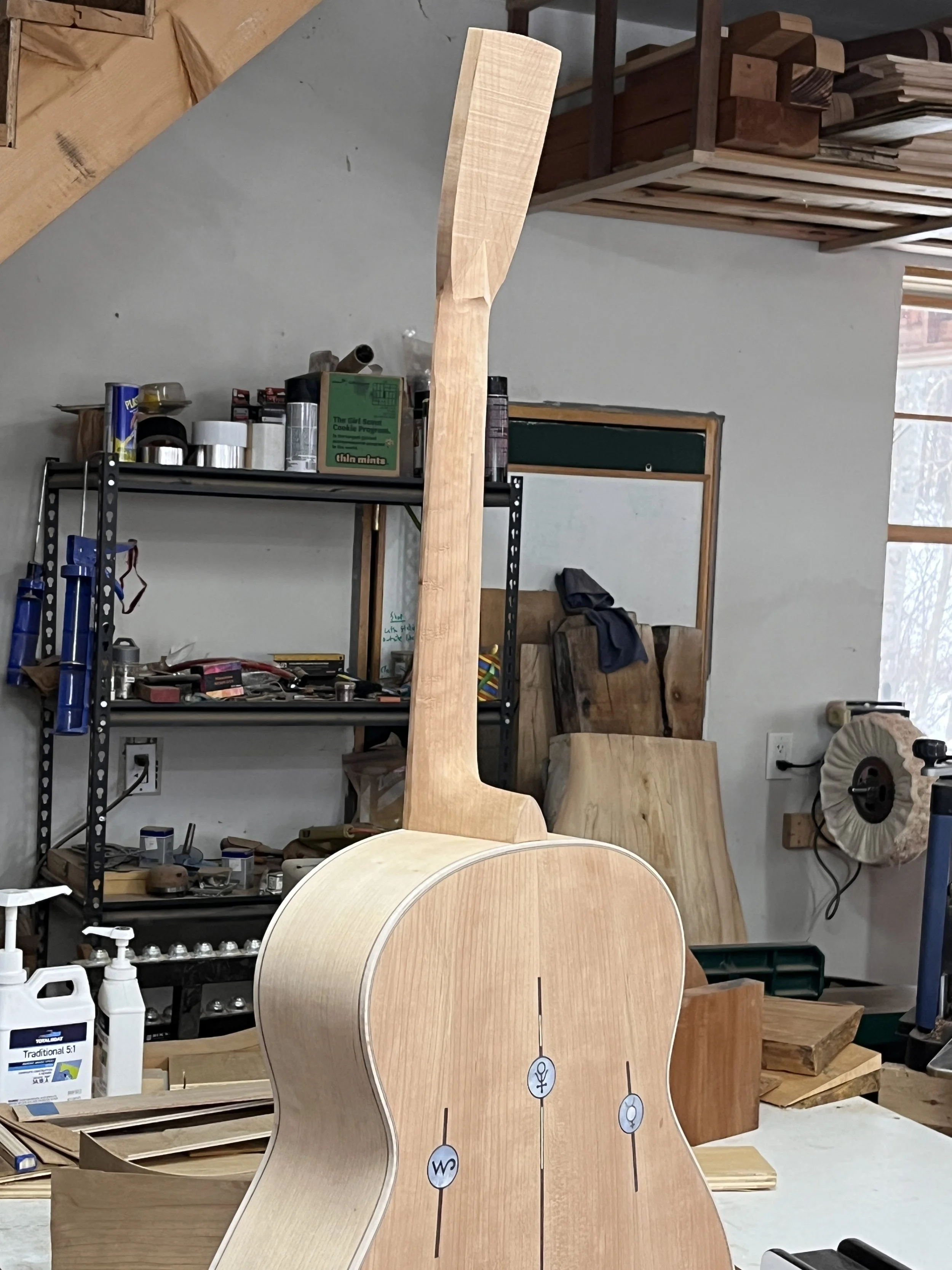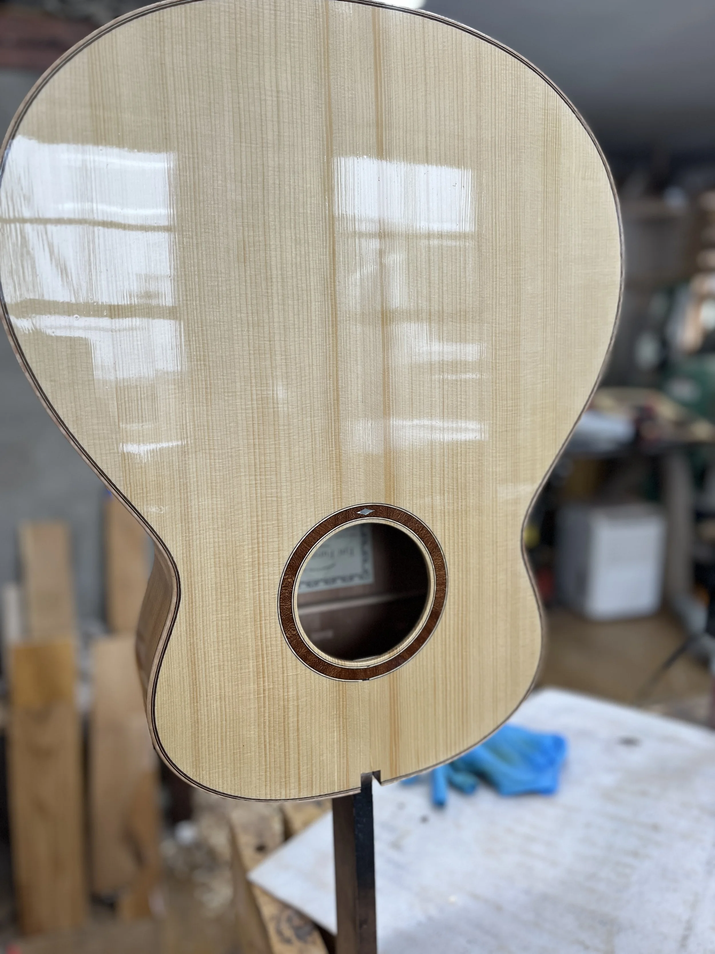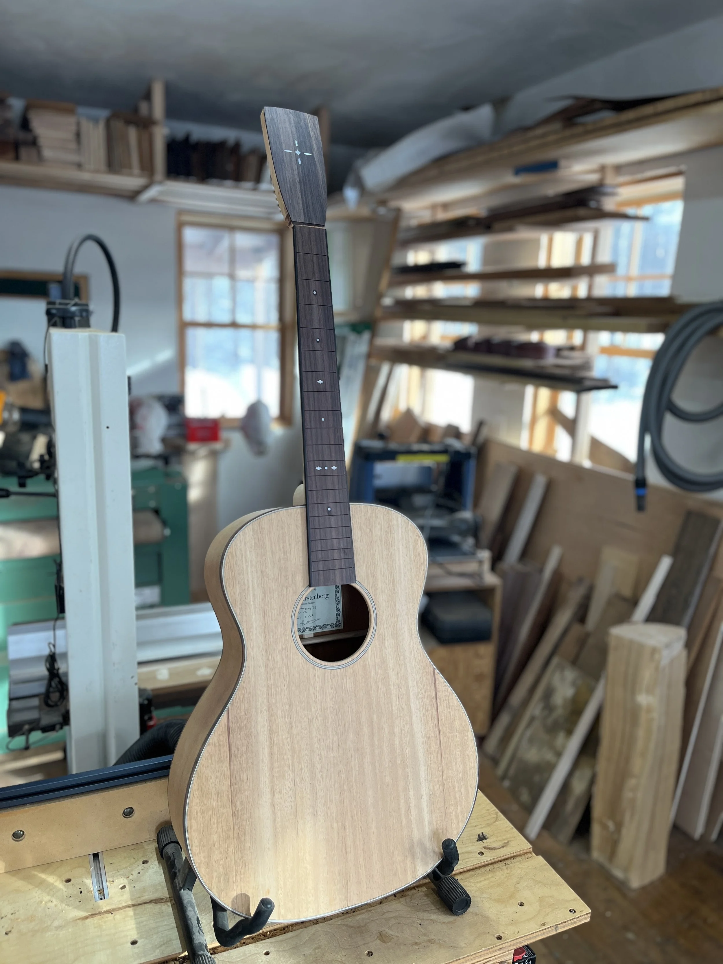 I am finishing up the walnut guitar described below, and hav started a new one. This one is 00 size, 25.5” scale, 13 fret neck, local Lyme NH spruce and Cuban mahogany. This guitar will follow a traditional build withe single ply sides and cloth reinforcement strips. W are aiming for a more vintage, open sound.