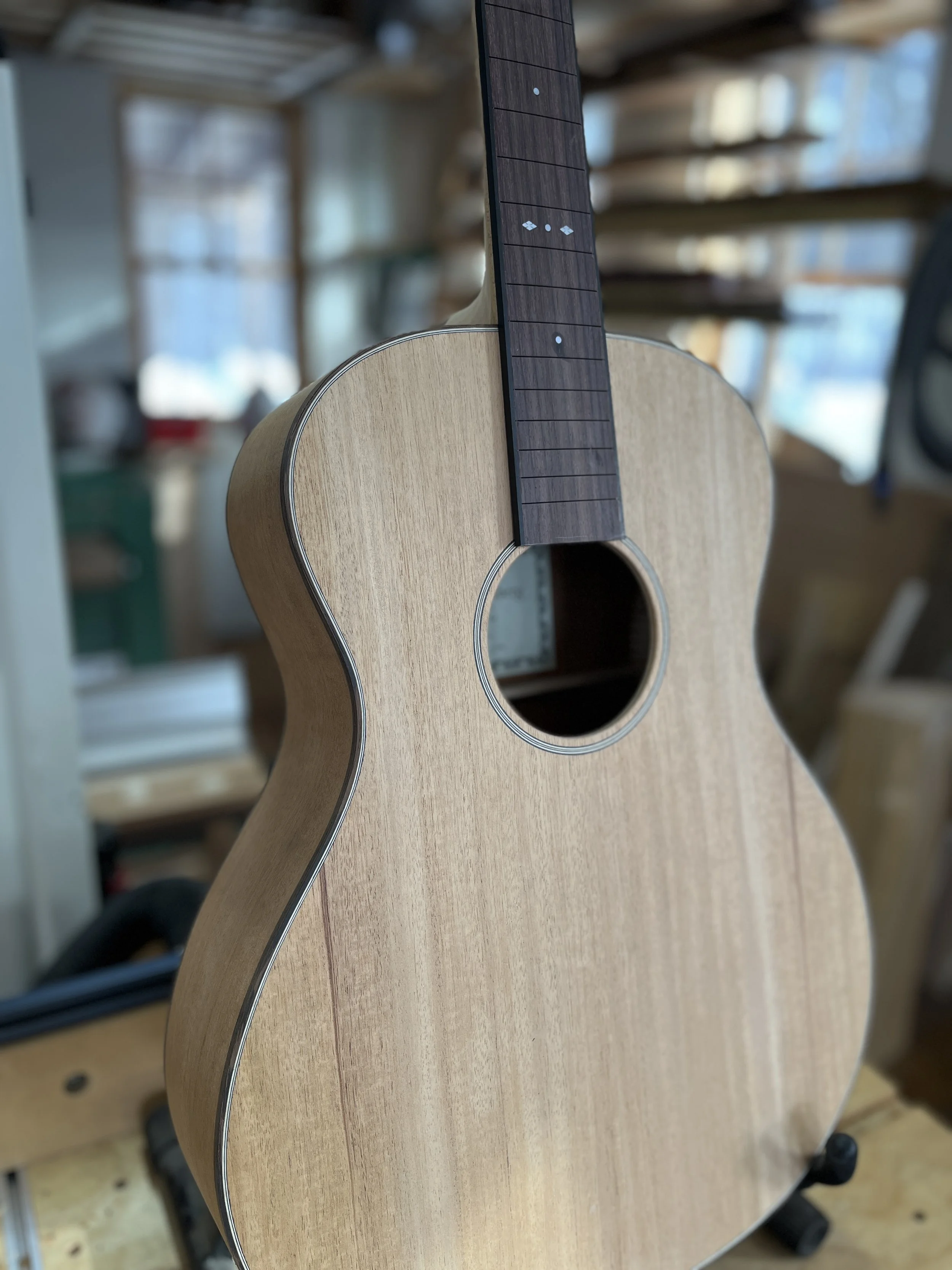 I closed the box on the mahogany guitar and have the neck and fingerboard roughed out. Should have finish on it early next week. Often the client will visit to handle the neck before the shaping is complete (one of the little benefits of a custom guitar).