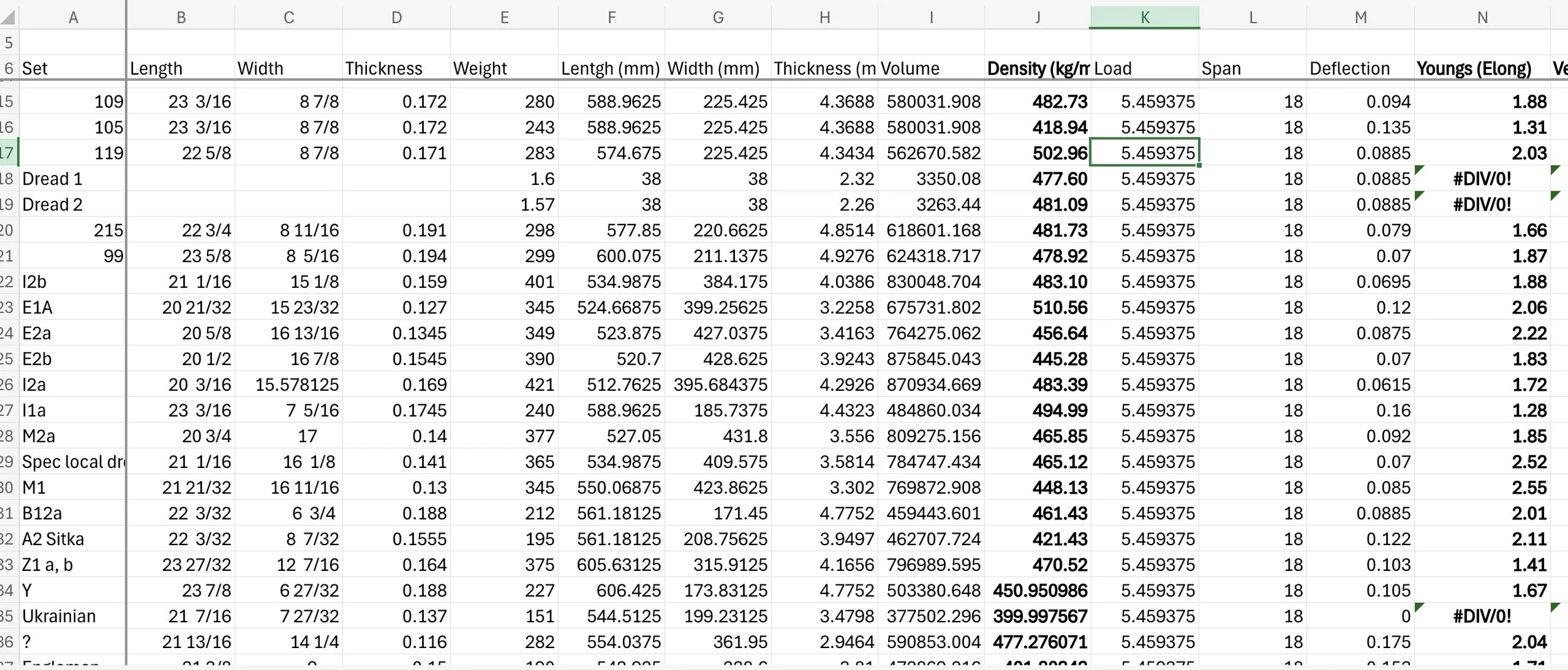 This is a little math-y, but the interesting thing is that the stiffness of spruce tracks density very closely. So a less dense piece will be less stiff. But that doesn’t control for thickness, and we don’t care about stiff spruce, we care about stiff soundboards. It turns out that the stiffness of a beam is related to the cube of the Young’s Modulus of Elasticity. So if you double the thickness of a beam, it gets 8 times as stiff. What this means for guitars is that if we are comparing two potential soundboards, and we thickness the two candidates to the same stiffness (not the same thickness), the less dense on will be thicker but lighter. In general this is a good thing, so I often look for spruce that is less dense to get a lighter soudboard and a more responsive guitar.