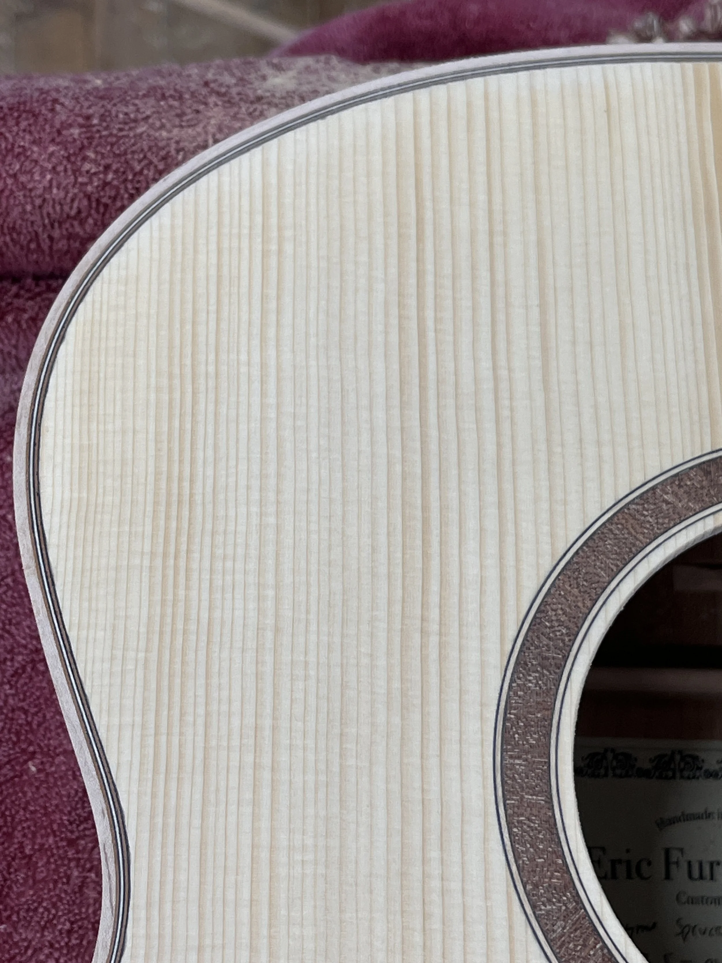 When I was evaluating tops for this guitar, few had the necessary cross grain stiffness for a body this wide. Looking at the free plate Chladni patterns, tops with good cross grain stiffness make well defined "ring" modes at the main top frequency. This is the top I chose for this guitar:
