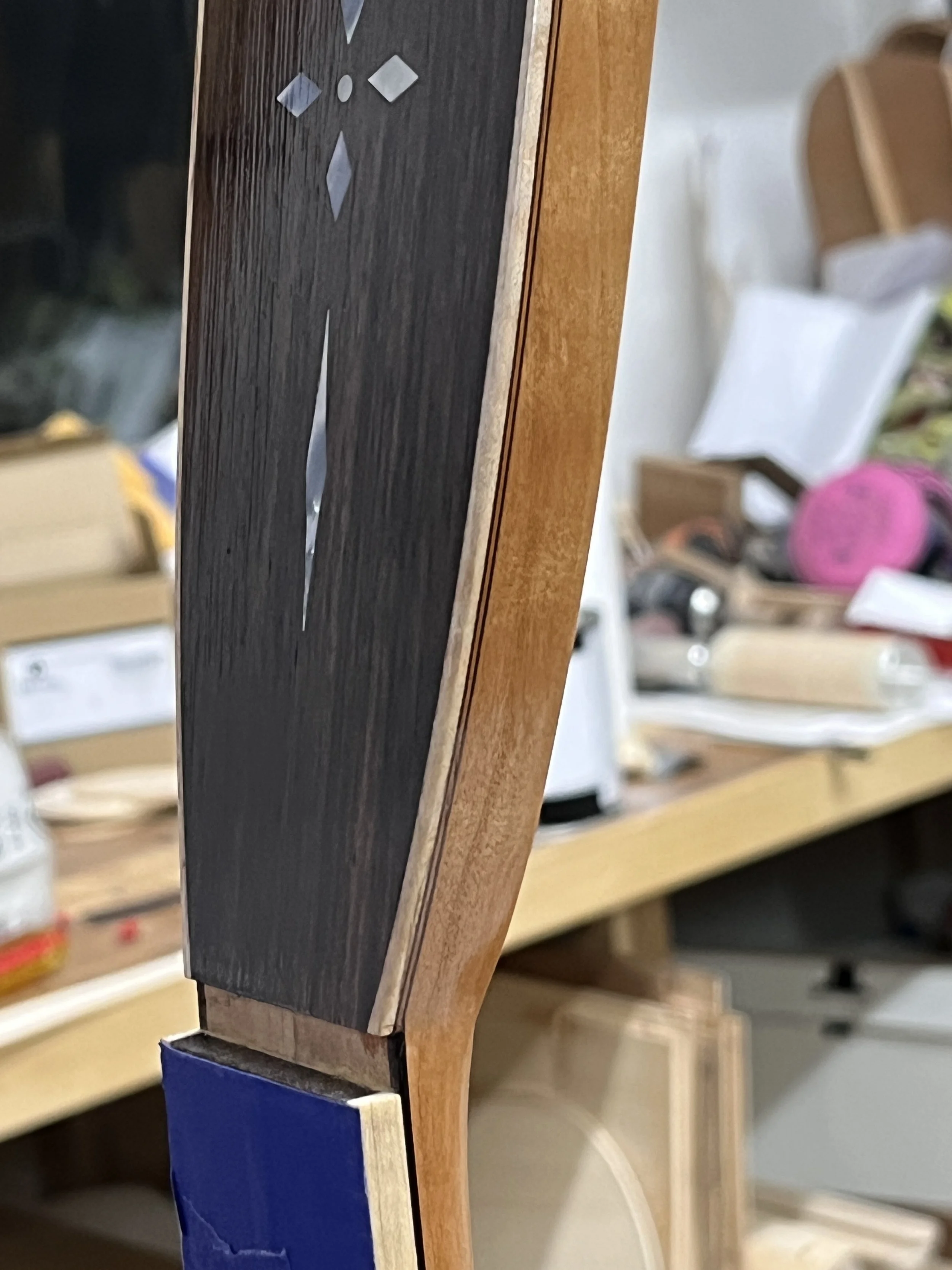 Getting the head plate ready for binding. There are so many little steps in this process! This guitar gets a custom cut MOP Ganesha, the Hindu god of good luck and patron of arts and sciences (among other things).